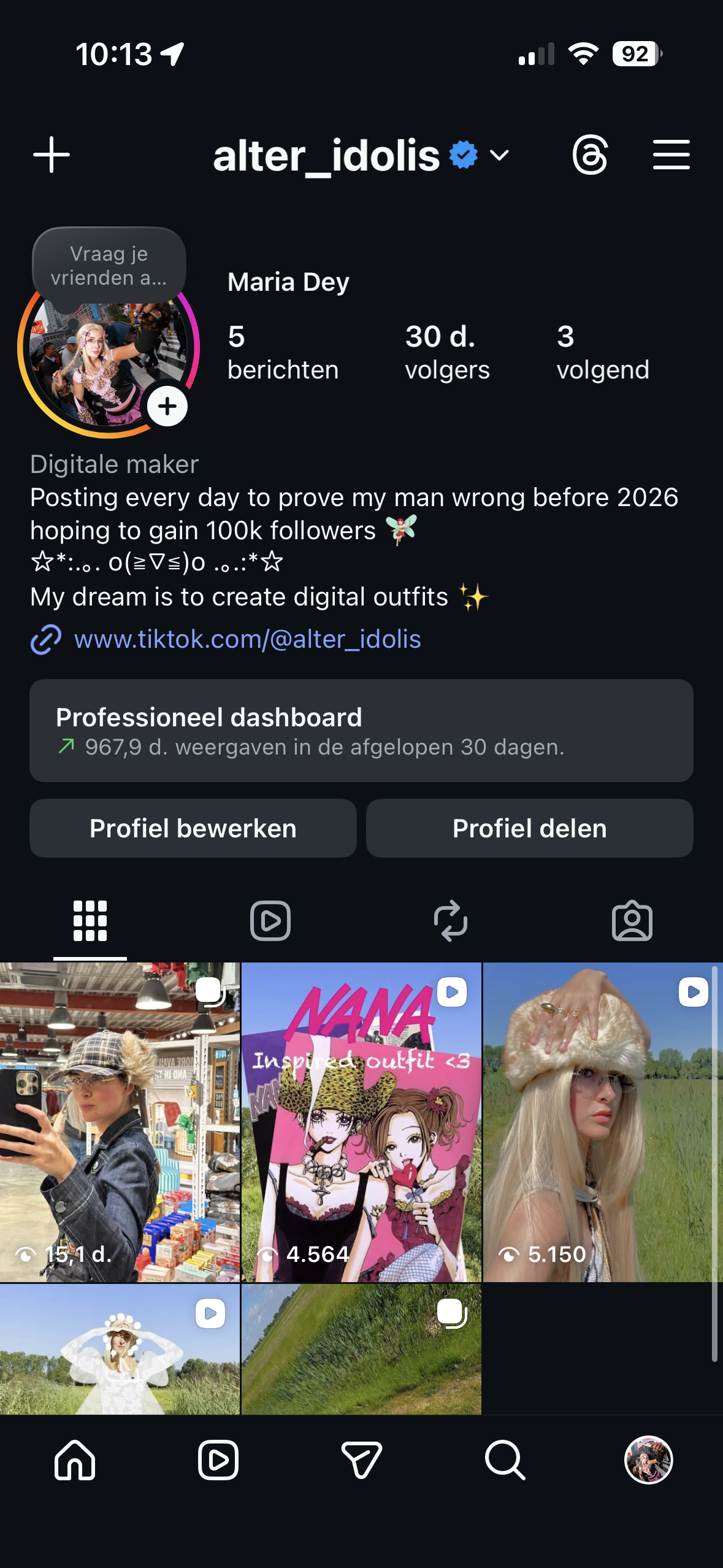 In addition to my work as a visual designer, I am active as a digital creator. By strategically experimenting with formats, visual styles, timing, hooks, and call-to-actions (CTAs), I achieved a growth of 30,000 followers on social media in December, with an average of 50,000 views per video. While it may initially appear as a typical “influencer account,” it is driven by a deliberate strategy: I leverage human triggers, build suspense through challenges like “prove my man wrong before 2026,” and use techniques such as doubling down to maximize engagement.
